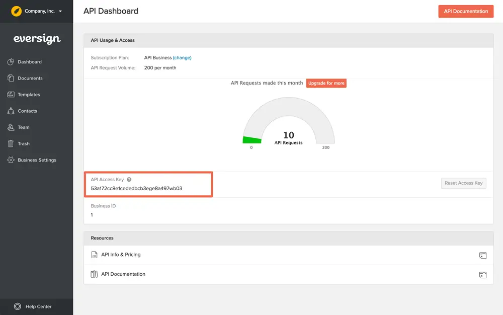 Each Xodo Sign account comes with a unique API access key, used to authenticate with the Xodo Sign API using HTTP GET. You can find your API access key by navigating to the top left dropdown menu and selecting "Developer".