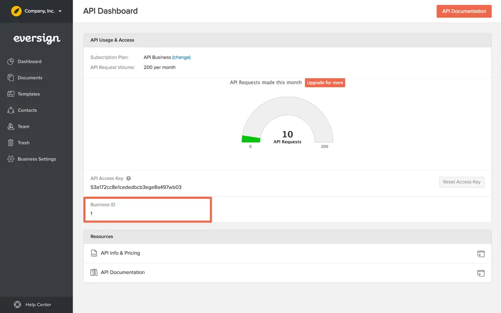 Each API request made to the Xodo Sign API should carry the API's business_id GET parameter within the API request URL. By logging in to one of your businesses and using the top left dropdown menu to navigate to the "Developer" page you can access your Business ID.