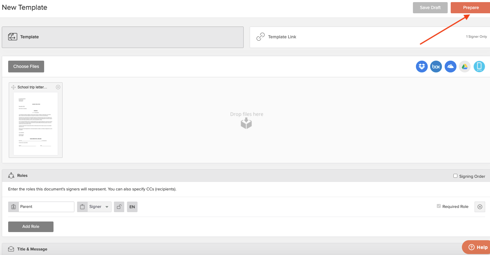 Now upload your PDF file by searching for it with Choose Files or by dropping it in the Drop Files Here area. Next, choose the signer roles. In our case, each letter needs to be singed by just one parent or tutor, so we'll have one signer. We'll call the signer role "Parent" (the name of each parent will be filled in automatically by Xodo Sign once you complete the bulk sending process).