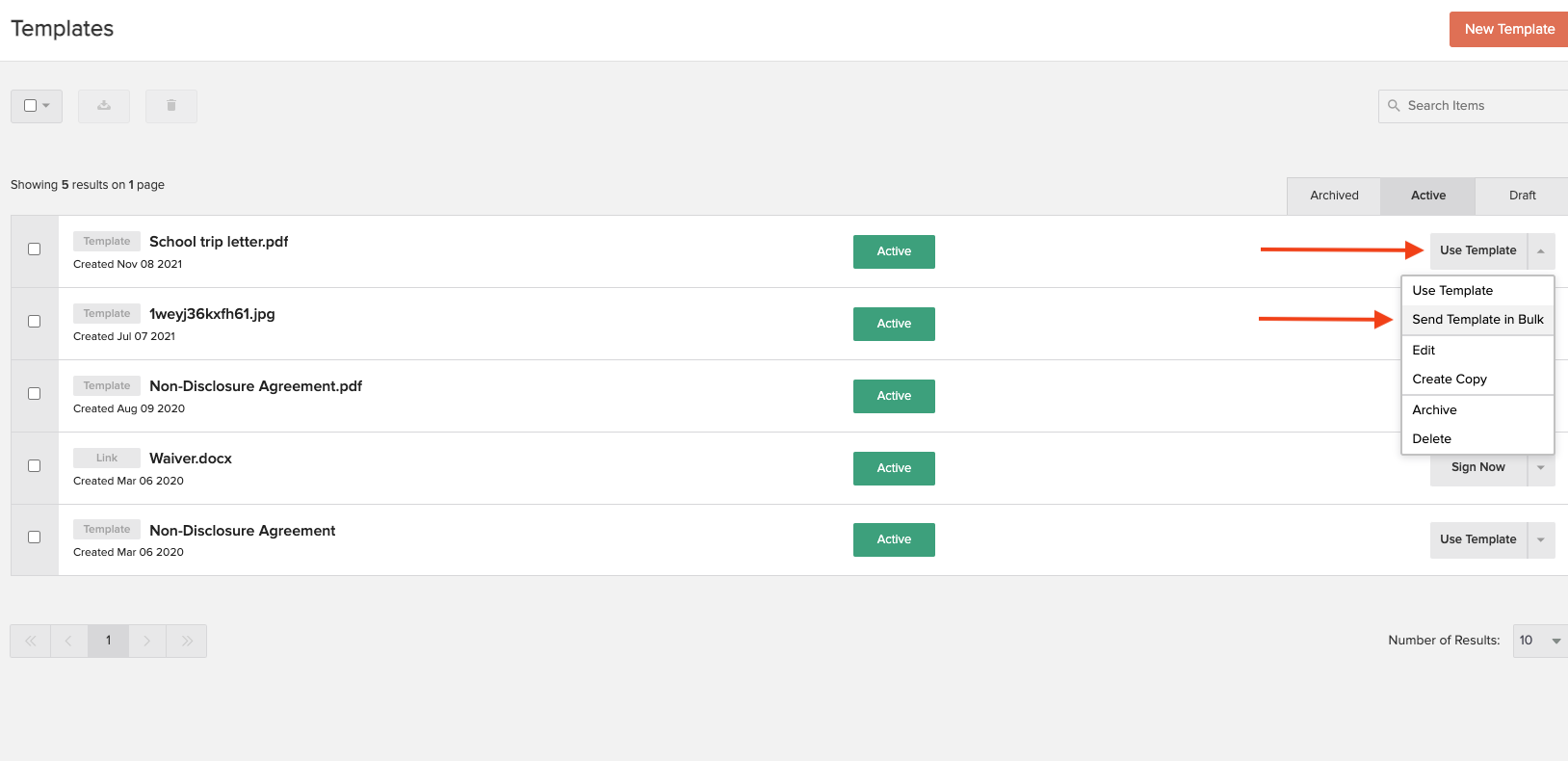 Click on the little arrow next to the Use Template button on the right side of your template, to open the drop-down menu like in the screenshot below. In this menu, click Send Templates in Bulk.