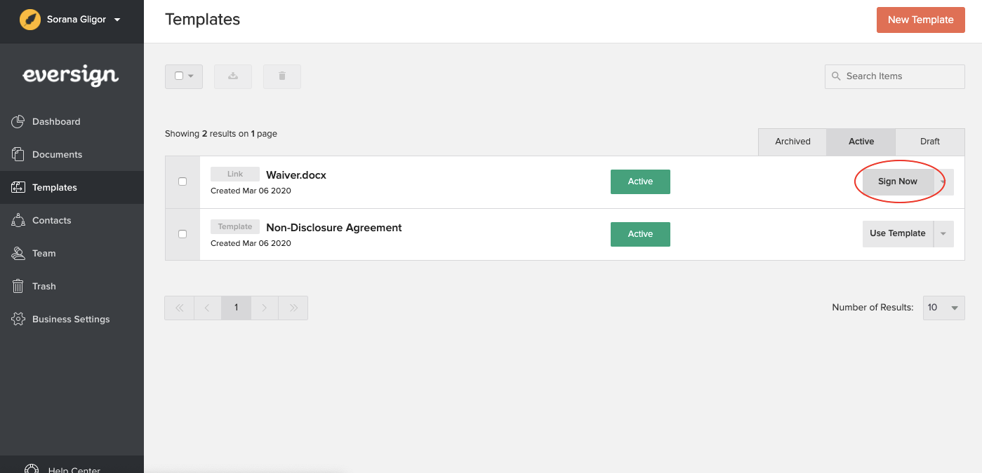 After enabling in-person signing, your signers can sign a template link directly on your device. To sign a document in person, simply look up your template link in your templates list and click the righthand "Sign Now" button.