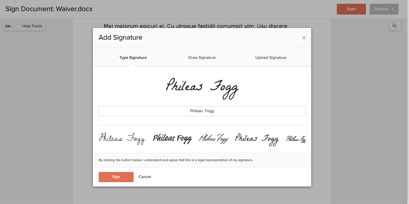 When clicking or tapping the sign box, a window appears, in which the signer can choose how to sign the document.