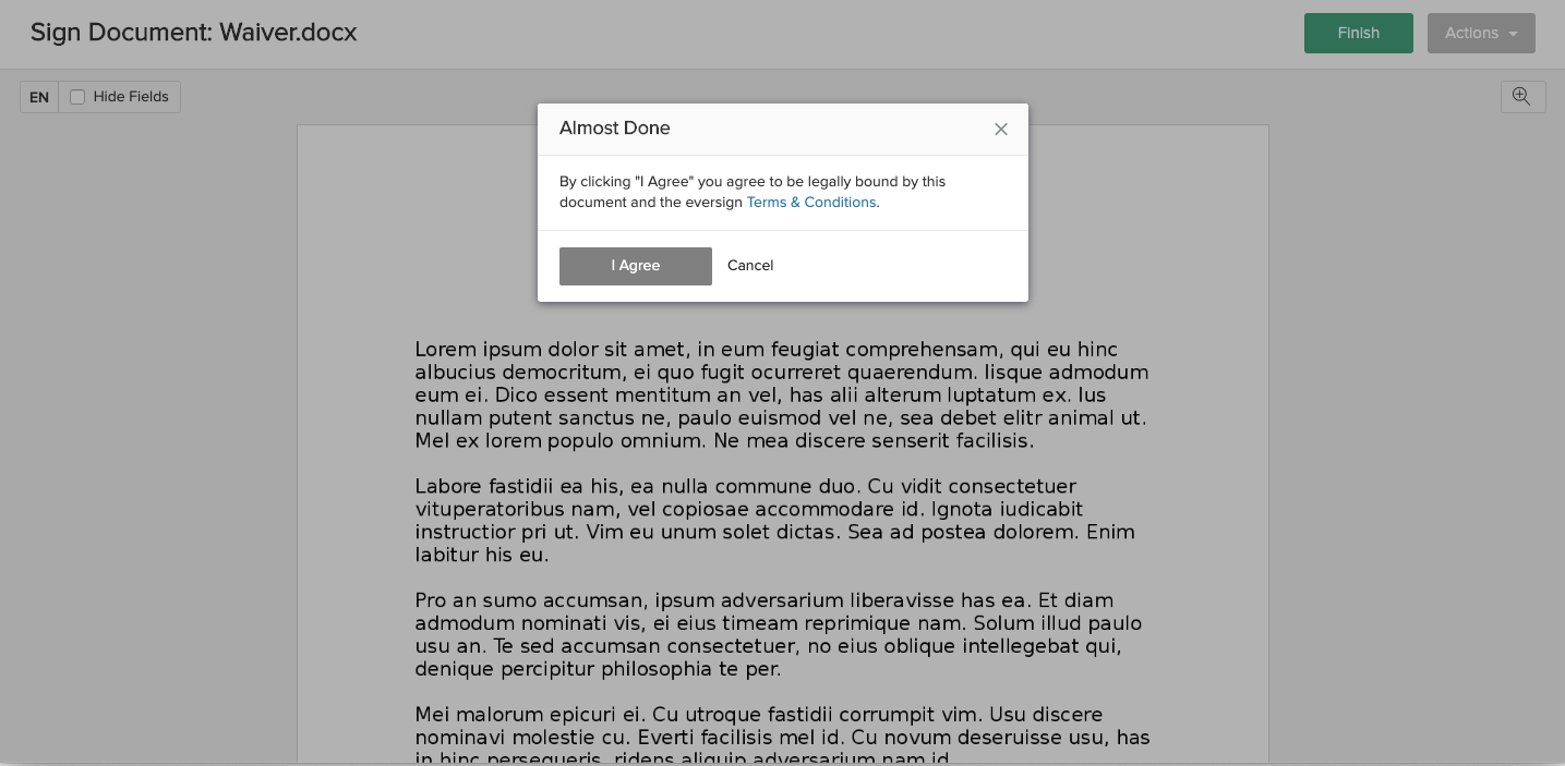 Next, they need to click the "Finish" button in the righthand upper corner (shown in the image above) and a popup window appears, informing the signer that by clicking "I agree", they will agree to be legally bound by the document and the Xodo Sign terms and conditions.