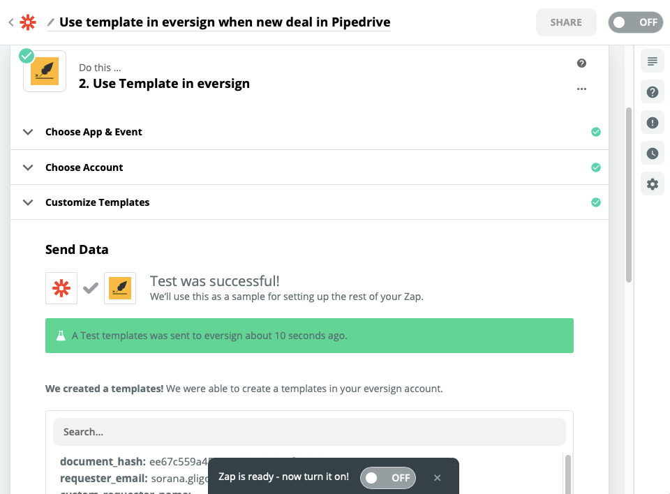 You can further customise the action if you wish. After that, just test the Zap and you’re done! You can turn it on now and it will send a template each time a new deal is added to your Pipedrive account.