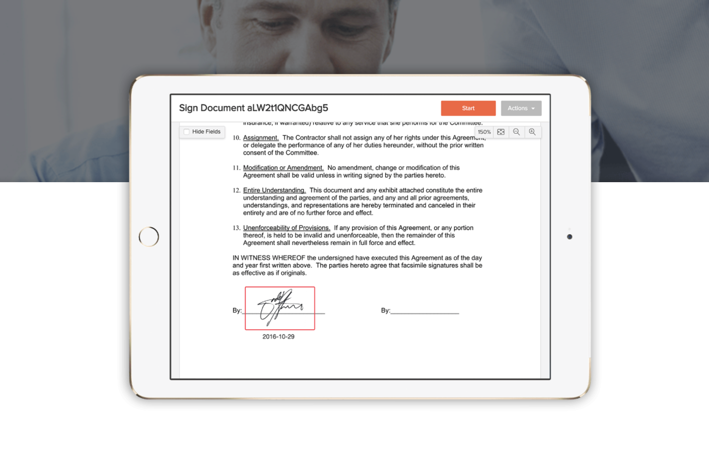 Xodo Sign Professional also includes In-Person Signing. This feature lets you use your tablet or laptop to sign documents in person. Just pop open the Xodo Sign web-app, upload a new document, and your client can sign right on your device, no email required.
