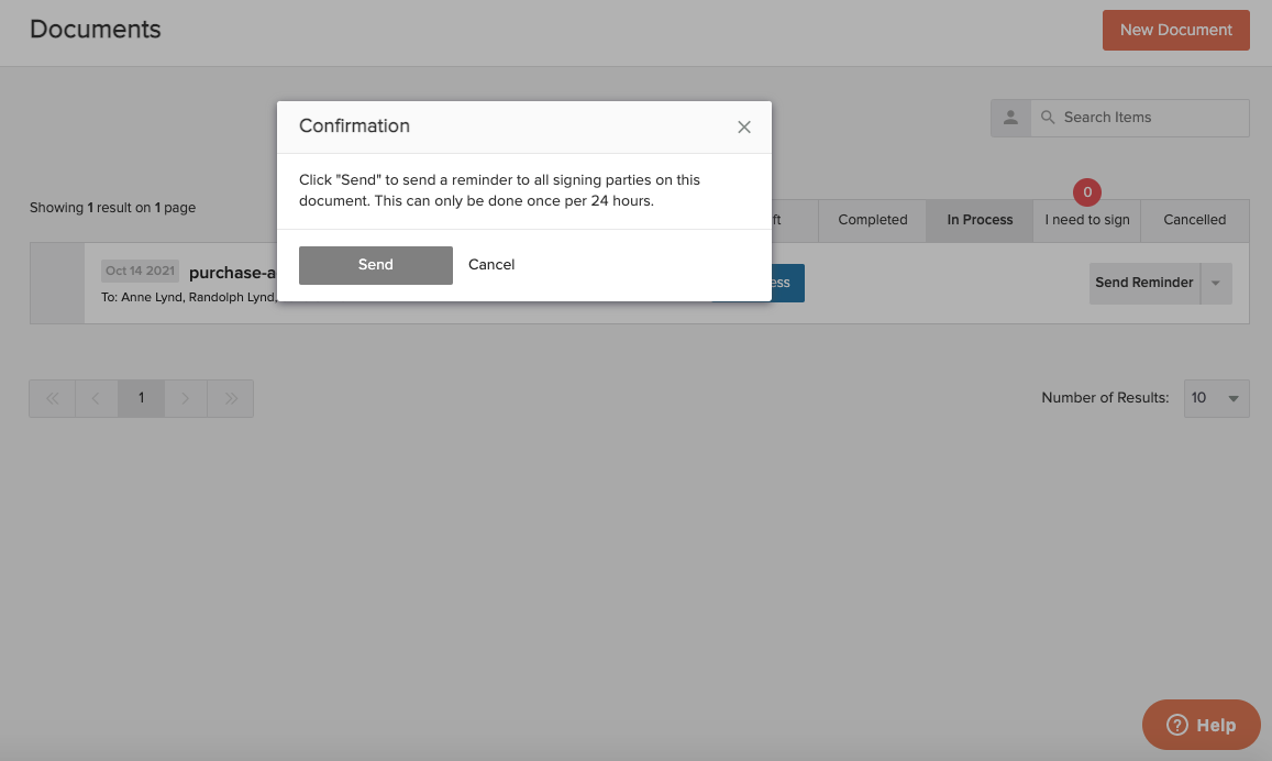 In order to send a reminder to all outstanding signers, go to your documents and find the document in question in the list of documents In Process (see screenshot below).