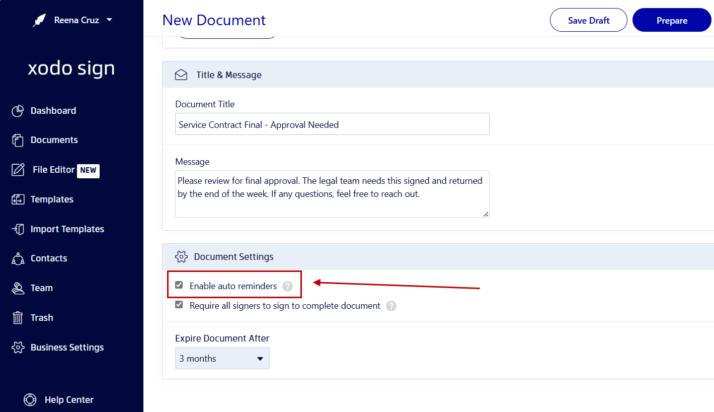 After adding signers, assigning roles, and drafting a message, check the Enable auto reminders checkbox under the "Document Settings" section.