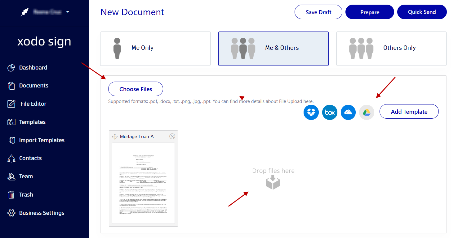You can upload PDF, Word, and image files to Xodo Sign. Note that non-PDF files convert automatically to PDFs you can edit and sign.