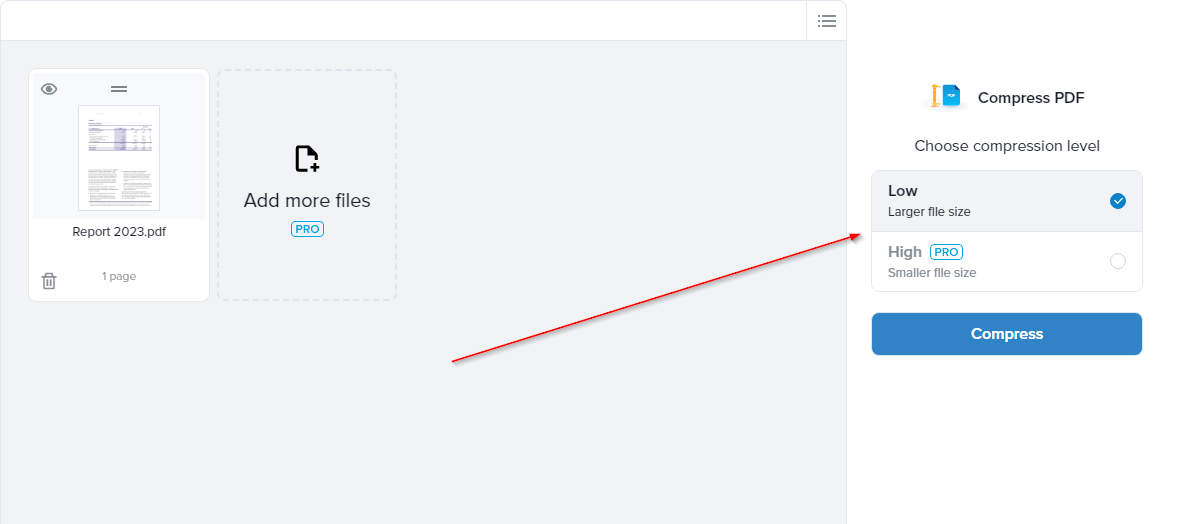 Once the PDF uploads, you can go ahead and choose the level of compression. You have the option between Low compression and High compression, the latter being a Pro feature that requires a free trial.
