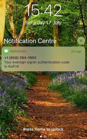 The sender of the SMS text might not appear as  eversign, but as a phone number or a name such as "SMS Info".