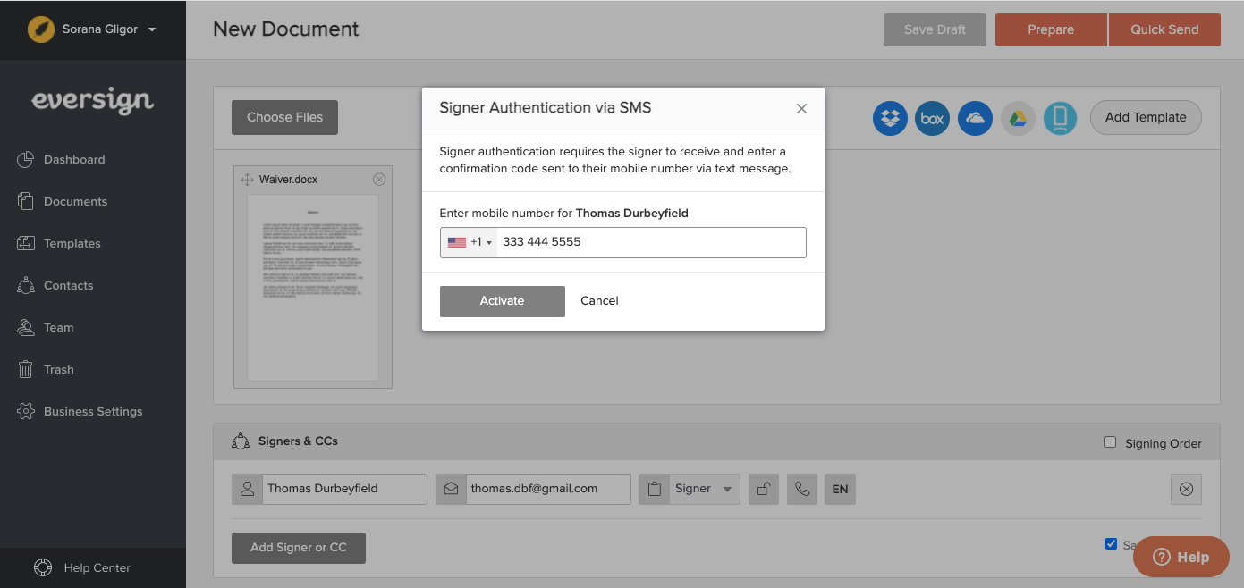 Signer Authentification via SMS is enabled by default for every eversign business, including free accounts.