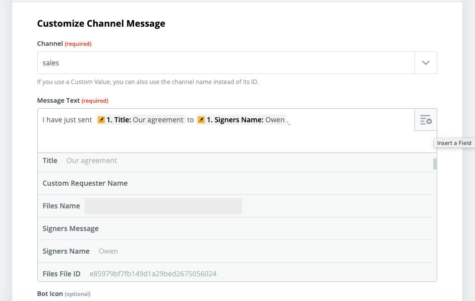 Next, choose the channel where you want to post the automated message and the data you want to send in the message. Click on the button in the upper right corner of the "Message Text" box to choose from a range of placeholders like “file name”, “title”, “signer’s name” or “signer’s ID” to insert in the message. These will be replaced with the actual data when you send the document which triggers the Slack message. You can also add plain text to the message, like in the example below.